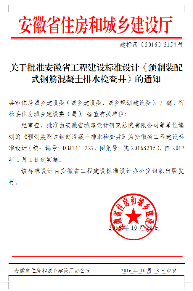 關(guān)于批準(zhǔn)安徽省工程建設(shè)標(biāo)準(zhǔn)設(shè)計《埋地排水用內(nèi)肋增強(qiáng)聚乙烯(PE)螺旋波紋管管道工程選用及安裝圖集》的通知